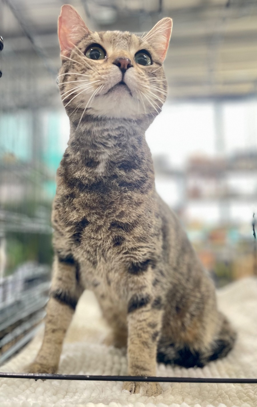 Kaz is a tall striking tabby female who loves a cuddle with her human servants but is not a fan of the other felines getting too close. If they give her some space, she lives amicably with them.