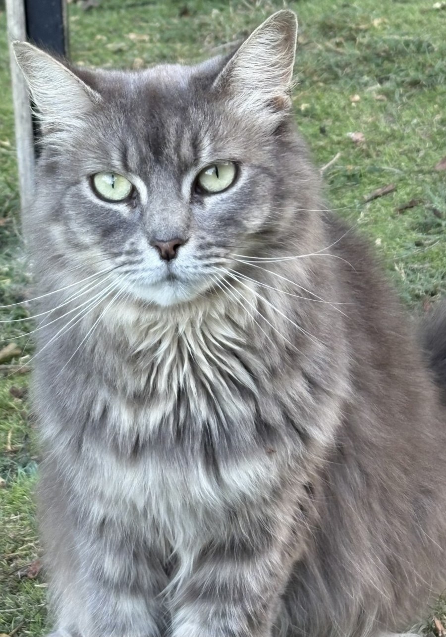 She is a rich grey medium hair with a super soft angora feeling coat which will require regular brushing.