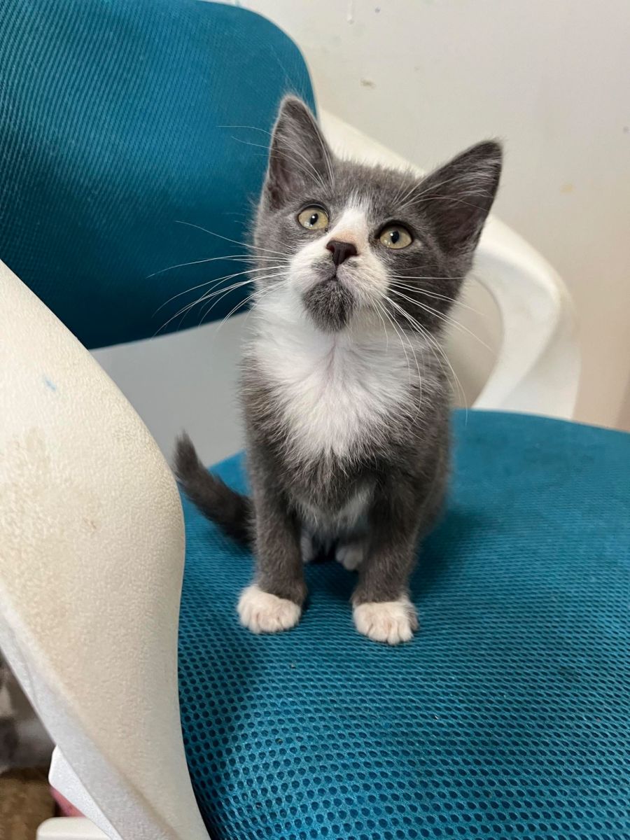 Fergie is a lively and adorable 10-week-old grey & white female Domestic Short Hair kitten. With her glamorous and fierce energy and playful demeanor, she is certain to bring a smile to your face every day.