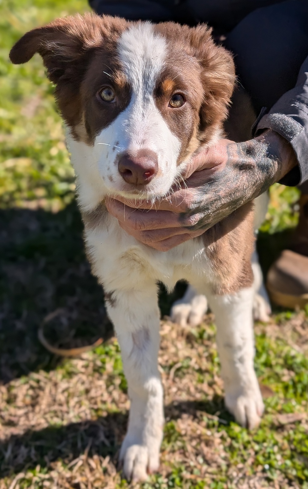 John is a 4-month-old chocolate and white Border Collie x Koolie pup bursting with energy and enthusiasm. This fun-loving little guy is eager to learn and grow into the best male he can be, and he's looking for a forever home where he can thrive.