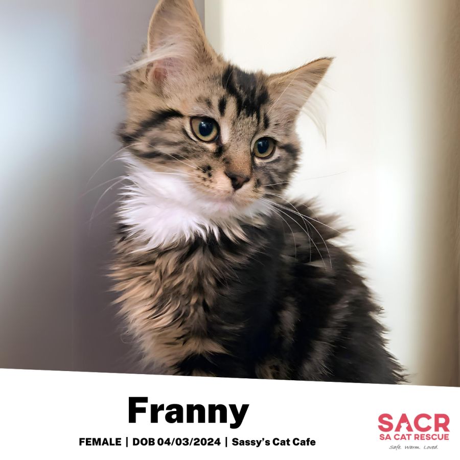 To sum it up, Franny is a warm, cuddly, and playful feline friend waiting for her new family. If you're looking for a sweet and loyal companion to share in all of life’s ups and downs, Franny will seamlessly become part of your home and forever hold a place in your hearts.