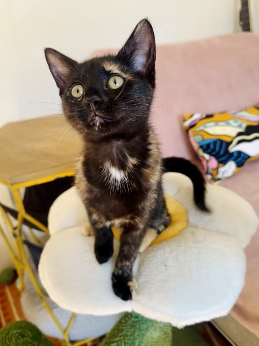Meet Ruby, a young female dark tortoiseshell kitten with a heart as beautiful as her unique coloring. Ruby is a sweet and gentle girl who loves nothing more than a good belly rub once she feels comfortable with you. While she may be a bit shy around strangers initially, it doesn't take long for her warm and patient personality to shine through.
