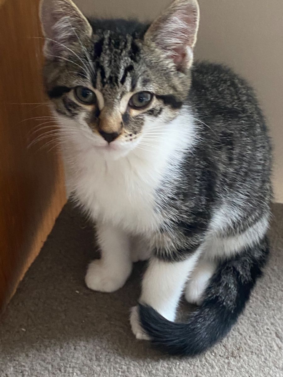 April is a pretty little thing but a bit of a Tom boy and can play as rough as her brothers. After zoomies and chasing toy mice she loves to cuddle up with her brothers especially Louie. She loves a cuddle and pats and exploring behind furniture. She gets on well with the older foster cats often snuggling up for a nap. She hasn’t been dog tested but with a slow introduction I’m sure she will love them. She would suit most family situations with gentle children.