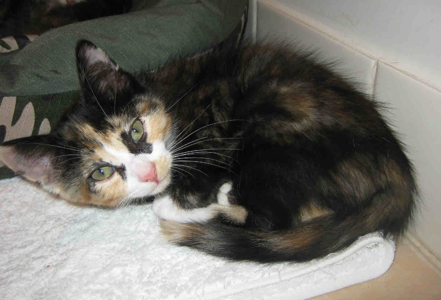 Louise is about 11 weeks old. She is a torti with a huge personality! she will follow you around and chat with you or just curl up and snooze on a lap. She plays great with the other kittens fantastic with children and dogs do not bother her