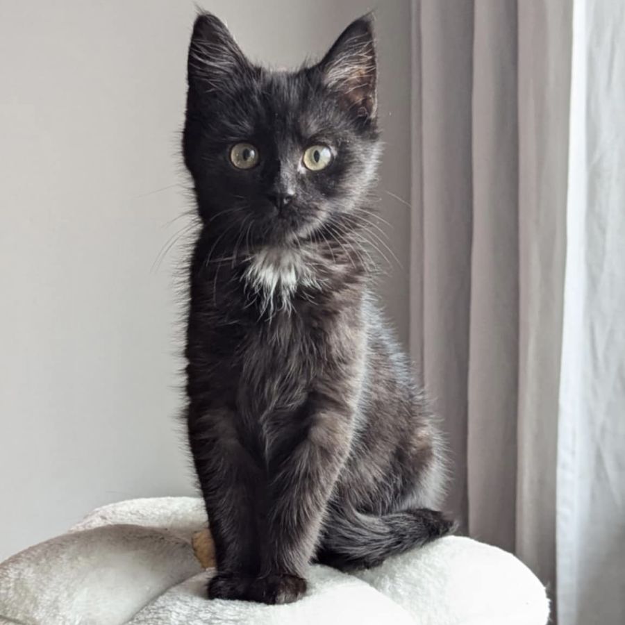Carlee is an adorable black kitten with a distinctive little white patch on her neck. Carlee may be shy at first, but once she feels comfortable, her playful and curious nature shines through. This independent little kitty loves to explore her surroundings and discover new adventures.