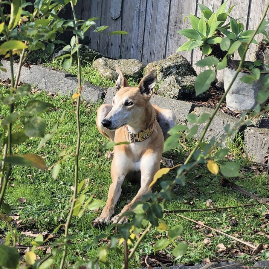 Jezza came to Greyt Greys with Ash, another female greyhound available for adoption, and while they're not bonded, they enjoy each other's company and playfulness! They are greyt mates and would be a delightful duo for someone looking to adopt two loving snoots!