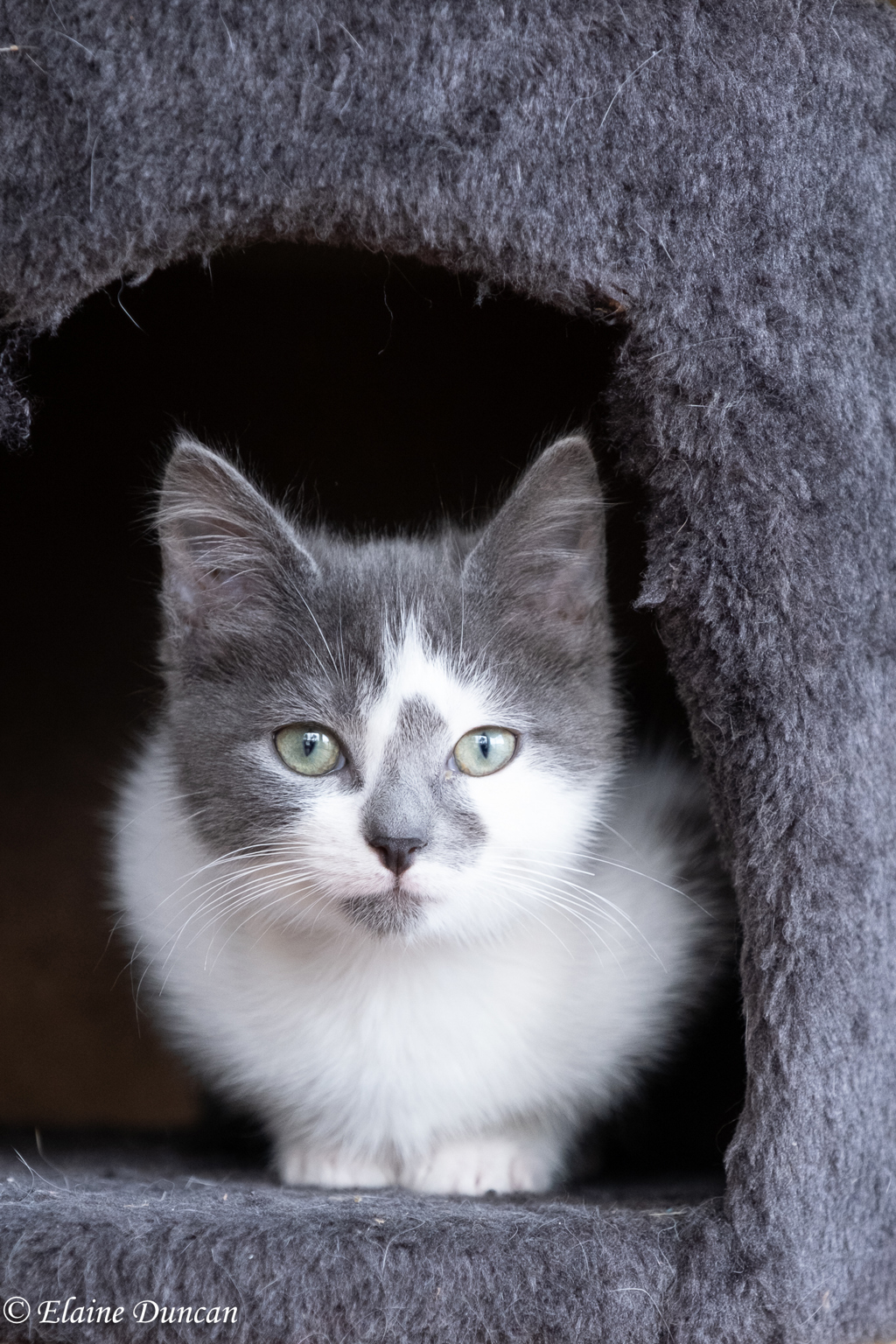 Mouse also loves to play with his kitty toys, especially a little white pom pom. But his favourite thing to do is definitely playing in a cardboard box, leaping in and out to surprise everyone who goes past. Mouse is also an excellent tail chaser, his own or others'...he just basically wants to be in the thick of any play and action.