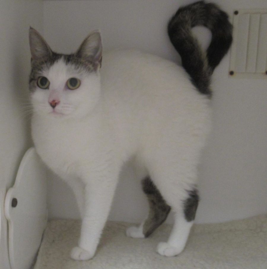 Meet Twinkle, a gorgeous 2-year-old white cat with unique tabby head markings and a completely tabby tail. This beautiful girl may have been a bit scared when she first arrived at SAFE, but she quickly came around and revealed her affectionate side. Though hesitant at first, Twinkle adores being stroked and is smoochy, showing her loving nature once she feels comfortable.