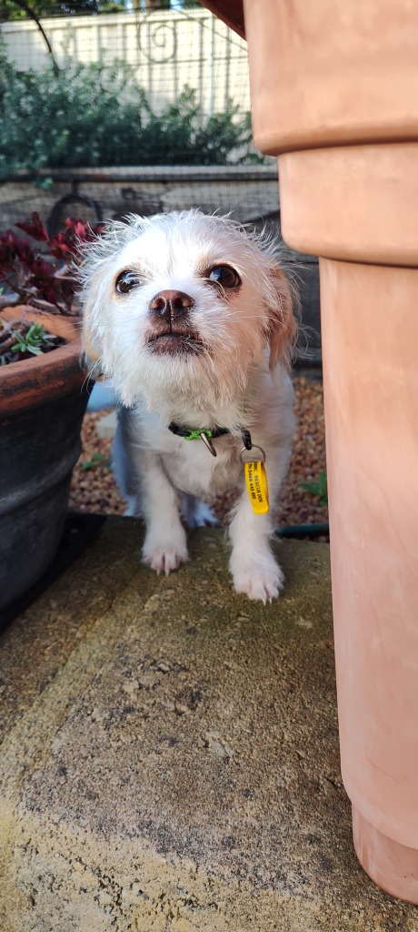 Ellie is just a delight looking longingly into your eyes. Her big eyes with her bedraggled scruffy appearance will be love at first site. She is playful but will stop when asked. She is a little land shark at the moment but the vet says her adult teeth are emerging now. After a good tug or war session with her house sister she is ready for a long nap. She is most definitely happy with any age group, and can certainly win over any dog loving person. She is 90% house trained having the occasional accident over night or when excited being patted.