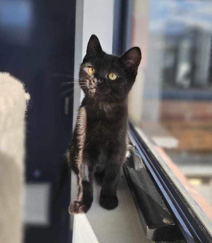 Meet Astrid, an enchanting 2-month-old black kitten whose soulful eyes and gentle demeanour will capture your heart from the moment you meet her.
