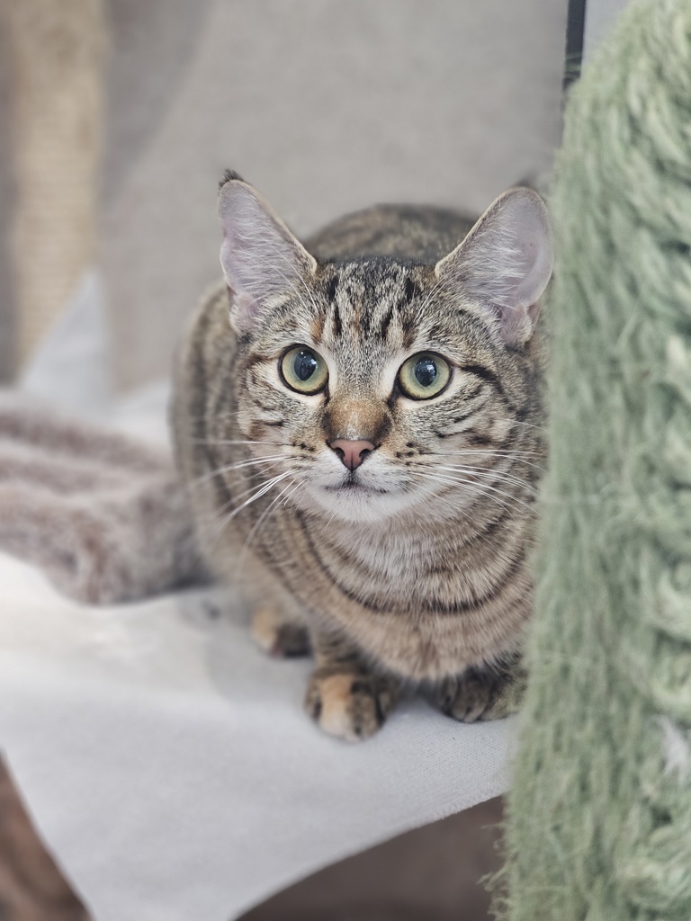 Pickle is making strides in bravery every day, showing more and more of her gentle and loving nature. While she's not quite ready for pats just yet, she has a charming way of letting you know she's around - by staring at you with those big, expectant eyes, especially when snacks are involved! Pickle gains a lot of confidence from having another cat in the household, so it would be necessary to have a friend for her in her new home.