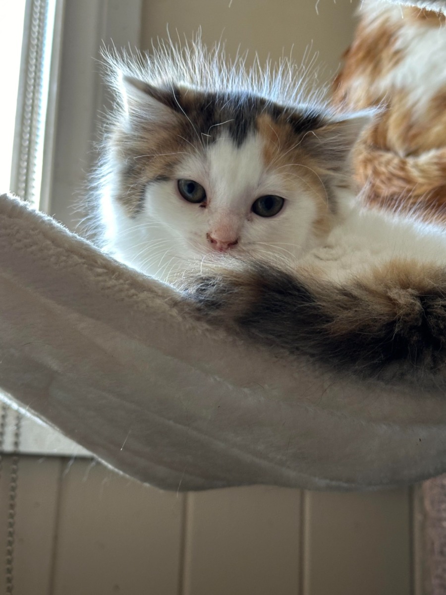 Her ideal home would offer plenty of one-on-one time which is important to build her confidence with her new people, slowly and steadily helping her emerge from her shell. Cotton Socks is an observer, often found perched on a windowsill watching the world go by, or nestled in a cozy corner, bright eyes keenly tracking your move with silent curiosity.