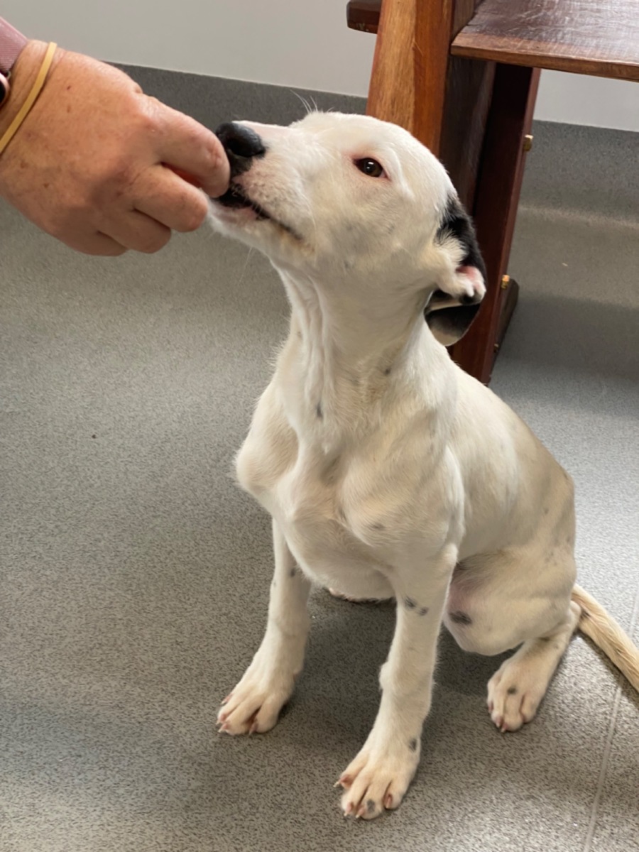 She has a sweet and loving personality and is eager to please. She loves pats and playtime. She’s is gradually learning her puppy manners but will need ongoing training once adopted.
