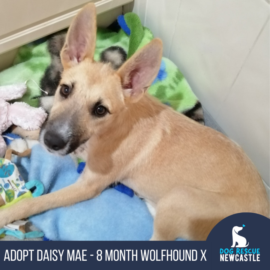 Daisy Mae is the dearest sweetest pup. Daisy Mae came from a terrible place where she was very much neglected and as a result is small for her breed. We think she may be a Wolfhound X. Daisy Mae is approx. 8 months old. It has taken a couple of months to help her realise that people are generally nice and kind, so now Daisy is ready to find her special home.
