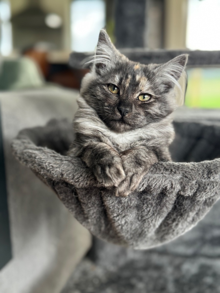 Griffon enjoys playing in tunnels & chasing dangly toys. When it’s nap time she will sit with you or on a tower close to you. Griffon has been living with a quiet dog that she has no issues with.