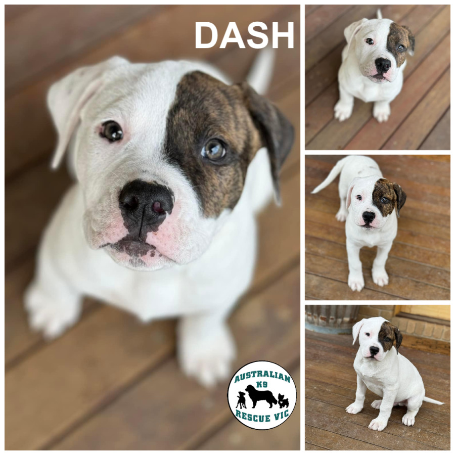 Dash has the loveliest soft thick snow white coat and the gentlest demeanor, he will melt your heart when you meet him .His adorable little Brindle patch over that left eye is certain to make him stand out from the crowd and his affectionate personality will ensure if you are a couch cuddler he would definitely be your boy. We feel based on his current weight he would be a larger size boy at full growth.