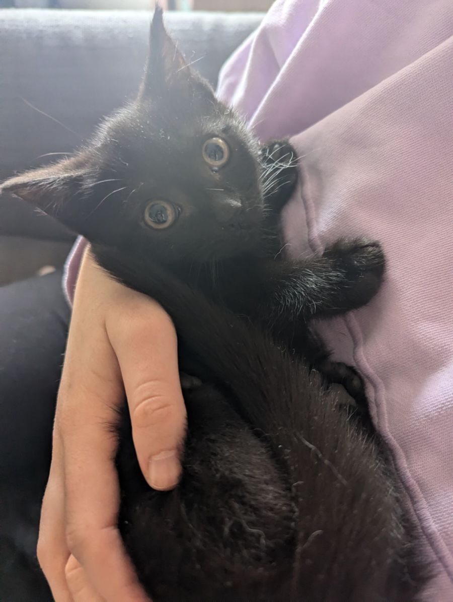 She’s always found nestled in a cozy spot, whether curled up alone or with her siblings piled on top of her! She’s content as long as she has a comfy surface to nap on.