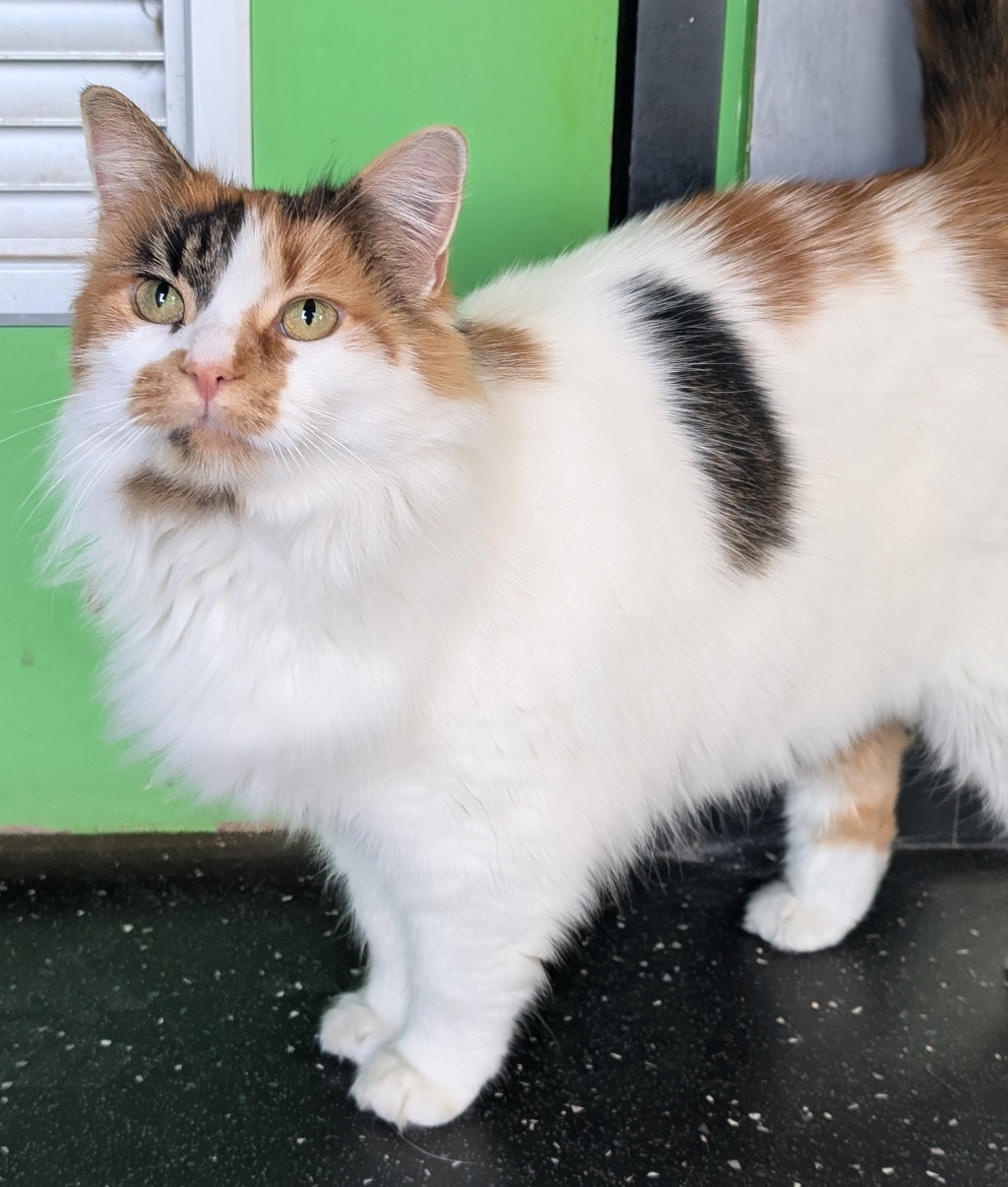 Meet Lady Marmalade, a beautiful Domestic Medium Hair (DMH) cat with a captivating calico and white coat.