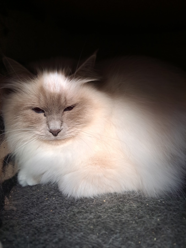 A sweet and quiet female Birman cat with a gentle disposition. She loves nothing more than a good chin scratch and finding cozy hidey holes for her frequent snoozes. Though affectionate, Amalia can become a bit stressed at times, so she needs a peaceful space where she can retreat and feel safe.
