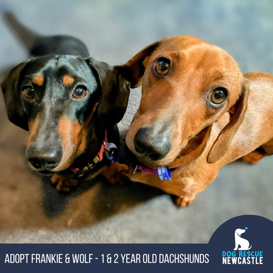 Miniature Dachshund dynamic duo Frankie and Wolf are ready to move onto the next chapter of their story, with their new forever family. 1 year old female Frankie, the stunning tan dapple and her trusty partner in fun, black and tan nearly 2 year old male Wolf are the best company for each other, for people and other small dogs.