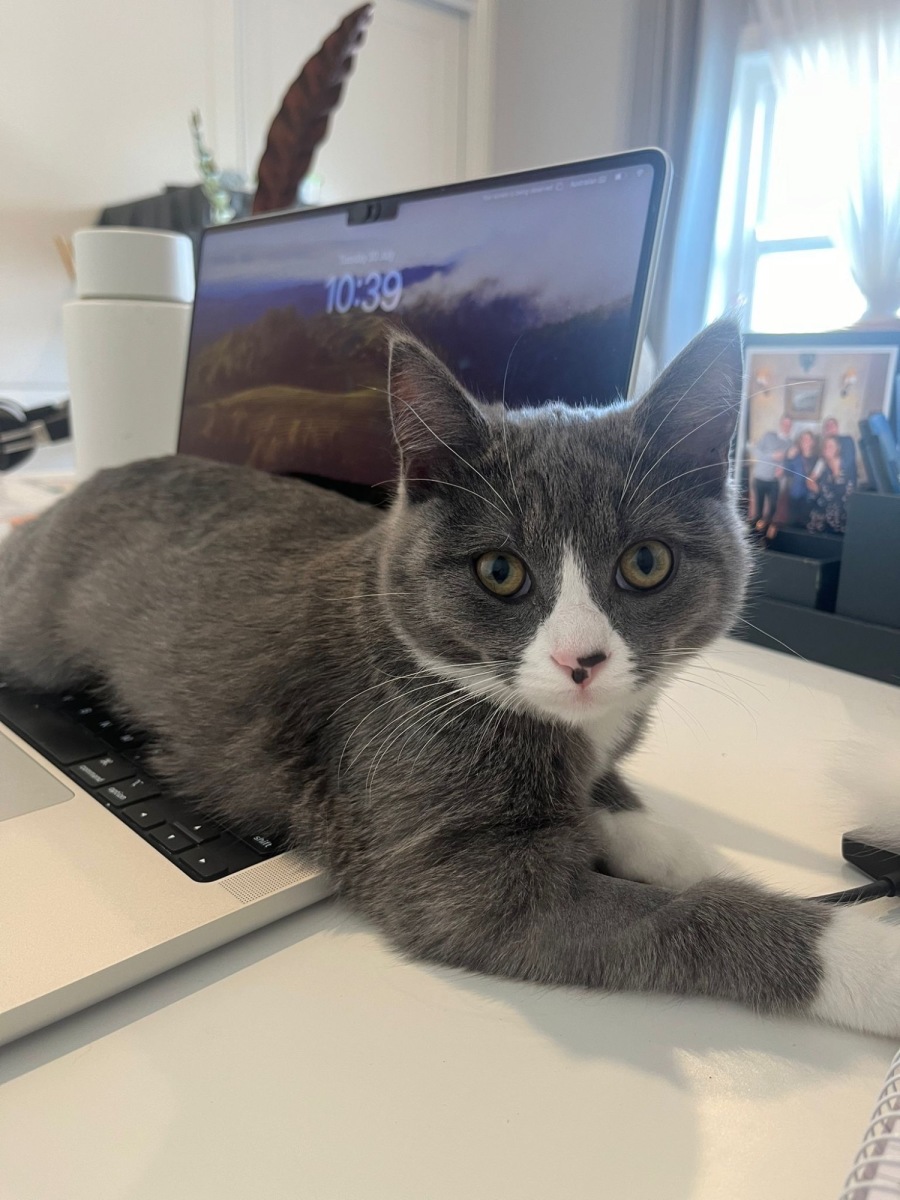 Meet Ashley, a grey and white kitten brimming with confidence and charm. This friendly little feline loves to make new friends and explore her surroundings with curiosity and enthusiasm.