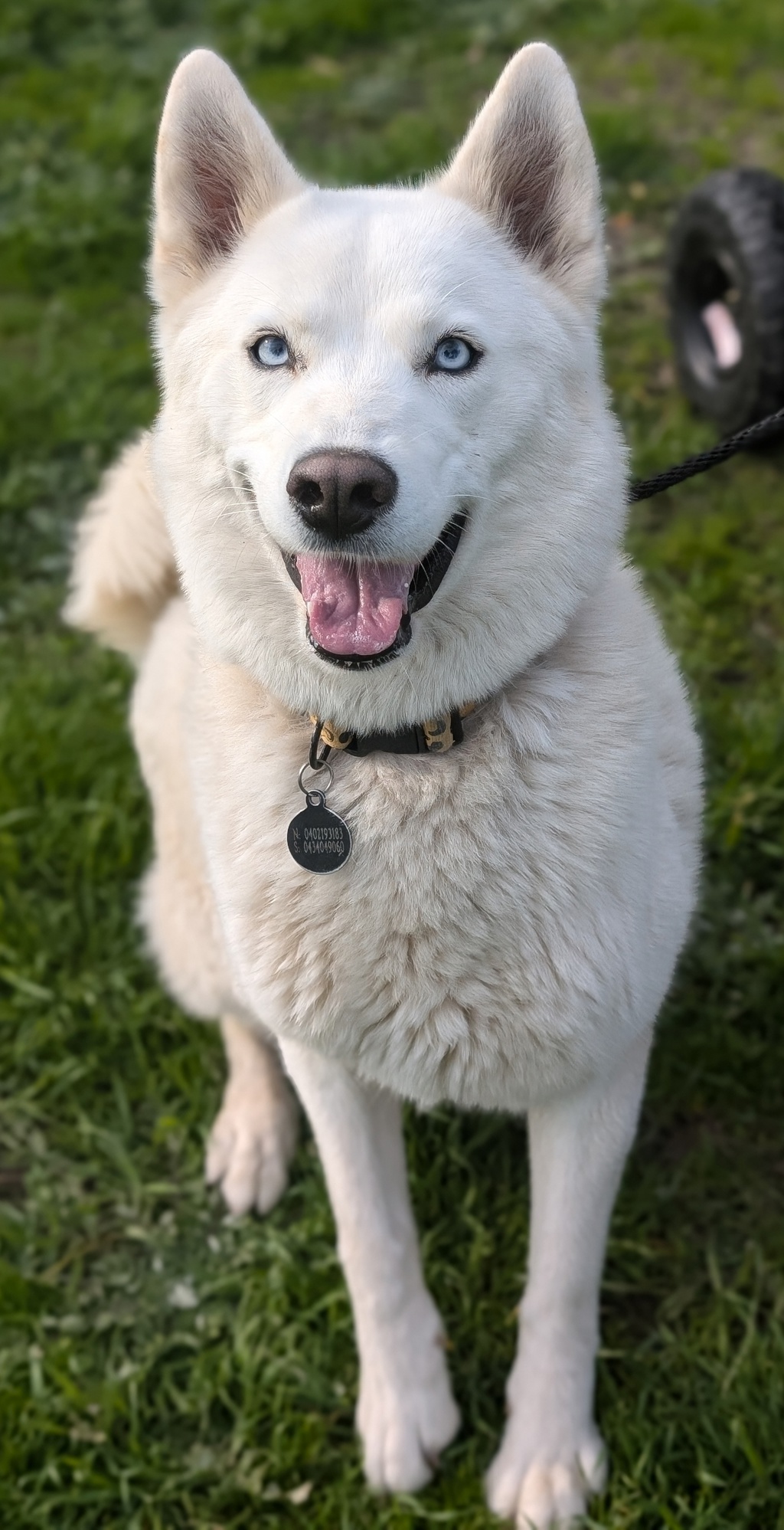 Meet Xylie, a beautiful 1-year and 11-month-old female Samoyed/Siberian Husky mix who is looking for her forever home. With her striking blue eyes and fluffy white coat, Xylie is sure to turn heads wherever she goes. But it's not just her looks that make her special-Xylie has a wonderful personality to match.
