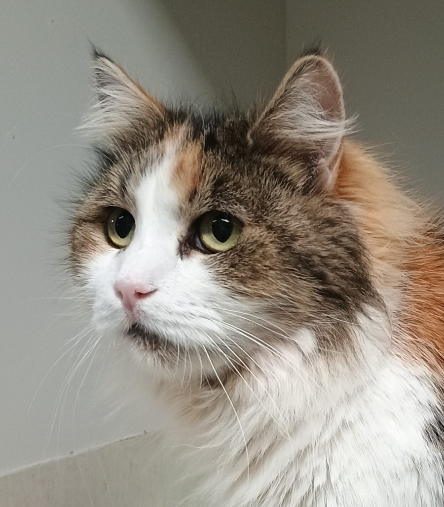 Meet Amelia, a sweet and affectionate calico cat who recently came to our shelter with her kitten. This young girl has a gentle, placid nature, making her the perfect companion for a peaceful home. With her medium-length fur and striking calico colours, she’s not just a beauty but also a joy to be around. Amelia loves being stroked and will happily curl up next to you, purring contentedly.