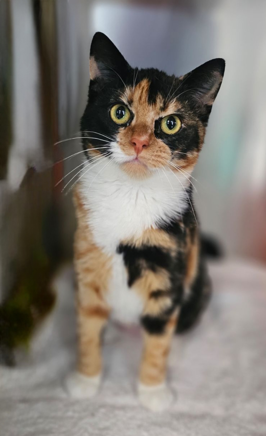Meet Coco, a beautiful older kitten with a stunning calico coat. Coco is a very shy feline with a quiet nature, making her best suited for a calm and peaceful home environment. She may take some time to warm up to new people, but with patience, love, and quiet encouragement, she will slowly come out of her shell.