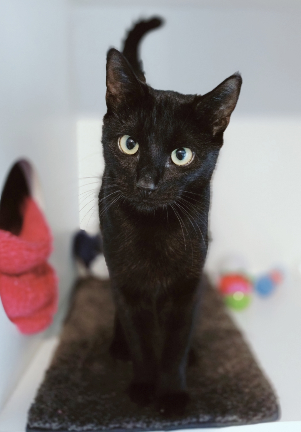 Meet Sadie, a beautiful young female kitten with shiny black fur. Sadie is a sweetie who loves attention and affection. She is always ready to cuddle up and purr in your lap.
