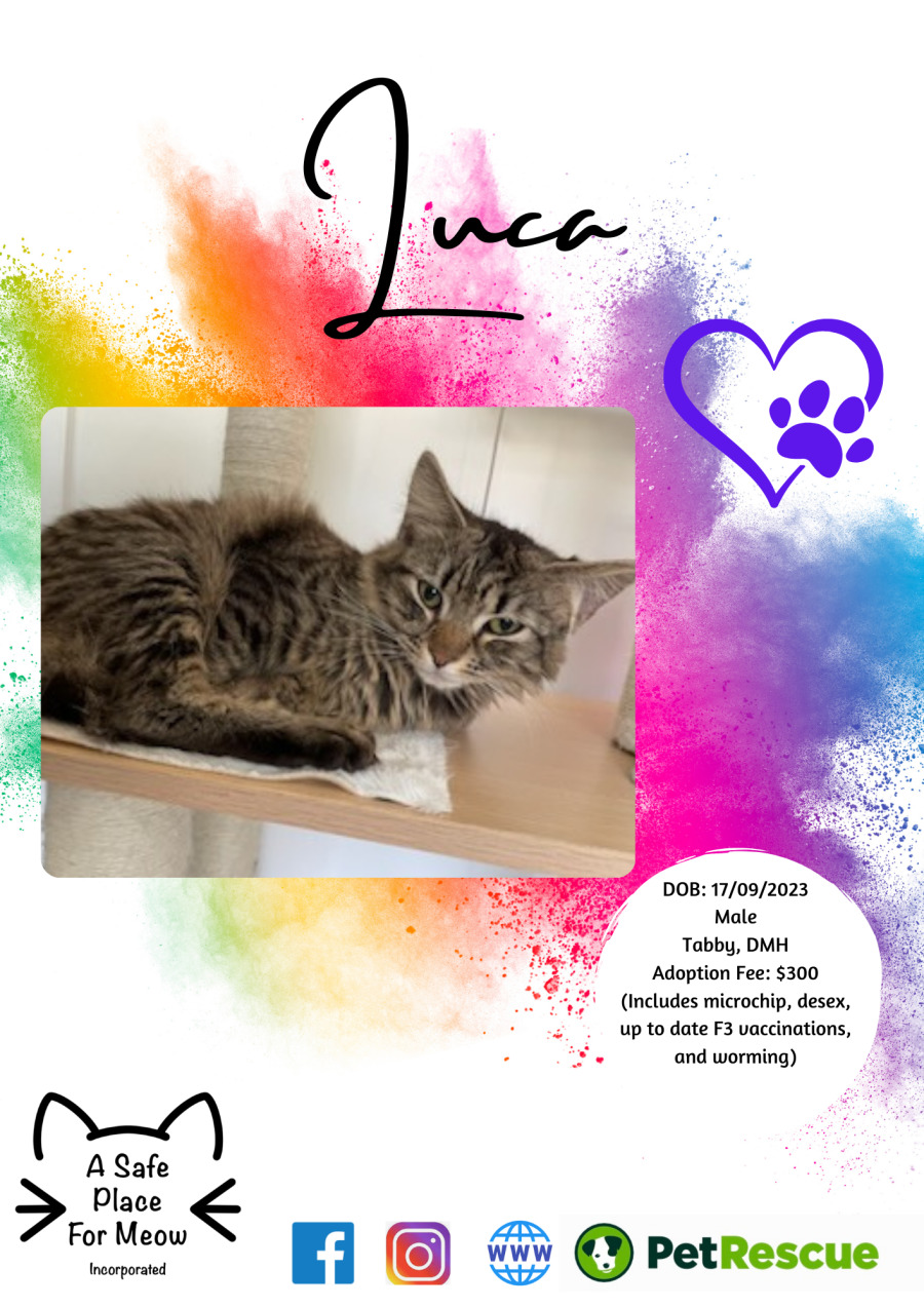 Luca is a beautiful soft and fluffy tabby boy who loves cuddles more than anything. He’s currently in foster care with cats and dogs and happy with all furry friends, but can sometimes boss around his other furry friends as he likes being the man of the house.