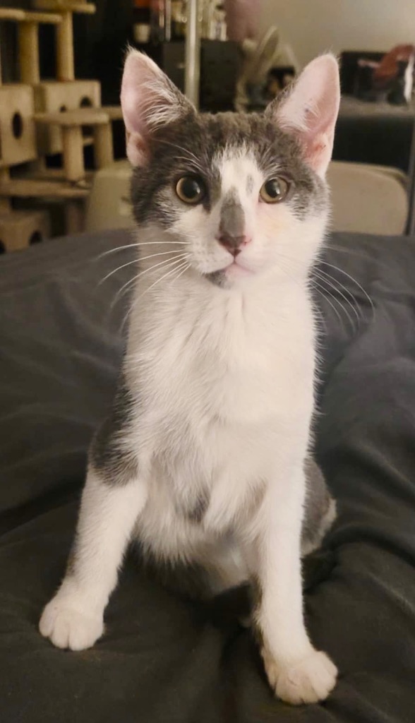 Nooshy May came to Cat People of Melbourne as a kitten with his mum and siblings. He is a four month old, grey and white, domestic short hair kitten with a grey smudge down his nose!