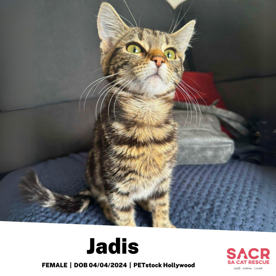 Jadis' adoption fee is $195 which includes desexing, microchipping, parasite prevention, and F3 vaccination.