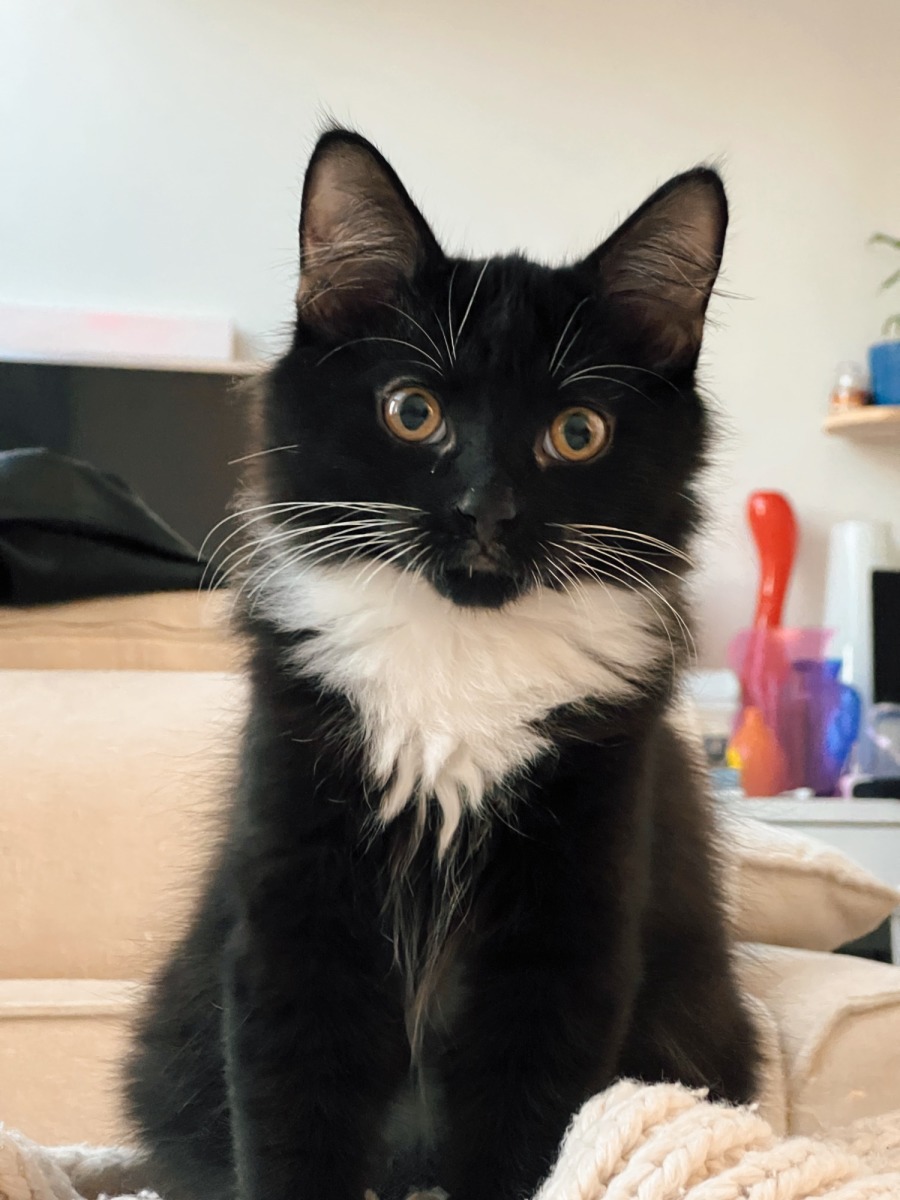 This black and white floofy boi with his white paws, chest, and uniquely delightful white-tipped tail!