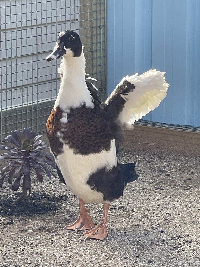 Polly is a beautiful black, brown, and white Muscovy duck who is the beloved daughter of Siri and Wubby. Polly stands out in her flock not only for her stunning appearance but also for her gentle and shy demeanour. While she is more reserved compared to the rest of her family, Polly's close bond with her parents and flock is a testament to her loving nature.