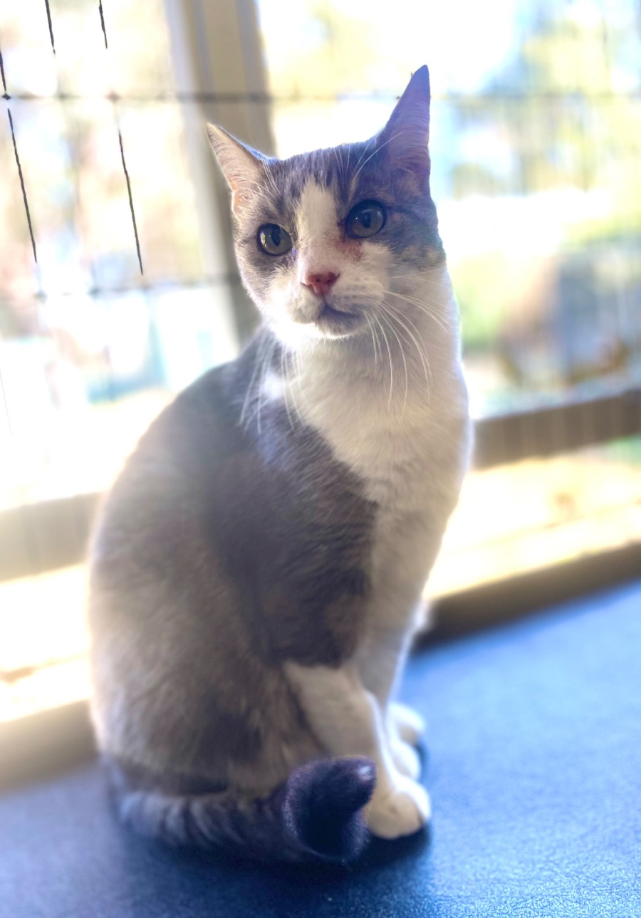 Munchkin is grey and white with a unique orange speck of patterns on her face. She does have excessive weeping of the eye which the vet isn’t bothered by, it is just something that happens with age. Her foster carer does wipe them daily for her.