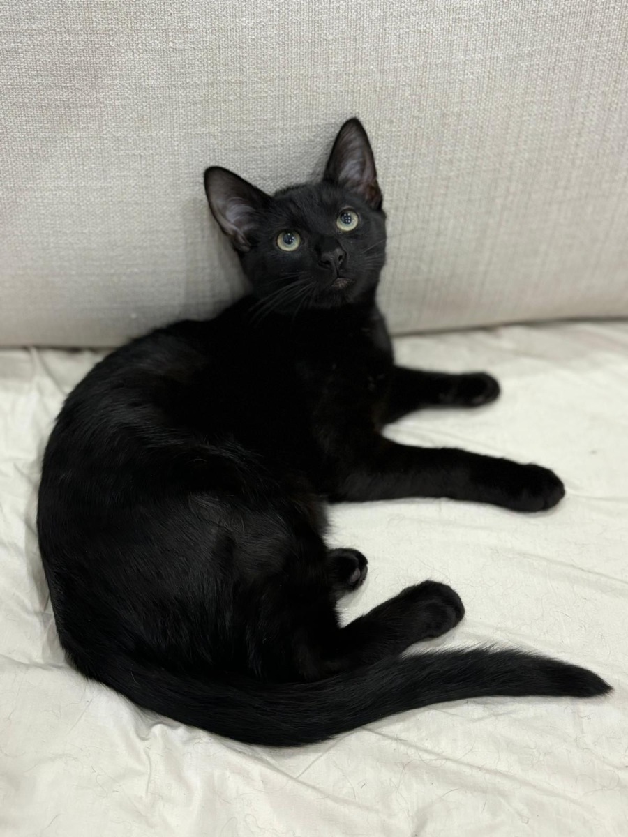 Meet Toby, the charming black kitten with an adorable white mark on his chest that sets him apart. This affectionate little furball has a knack for melting hearts with his loving demeanor and playful antics.