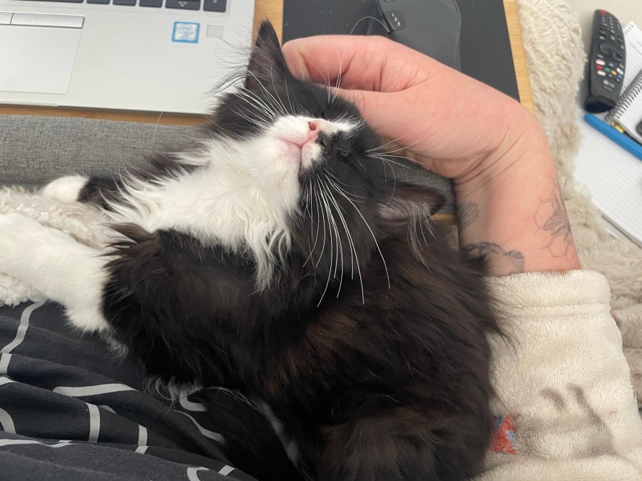 Max is a thrill-seeker in his daylight hours, romping with his fraternal sidekicks and performing the feline Olympics, aka zoomies! When he's all tuckered out from his antics, he'll often find solace against his foster mum, drifting off to kitten dreamland. Max also has a knack for "baking biscuits," otherwise known as kneading, often seen on your cozy blanket or pillow when he's seeking some extra warmth or comfort.