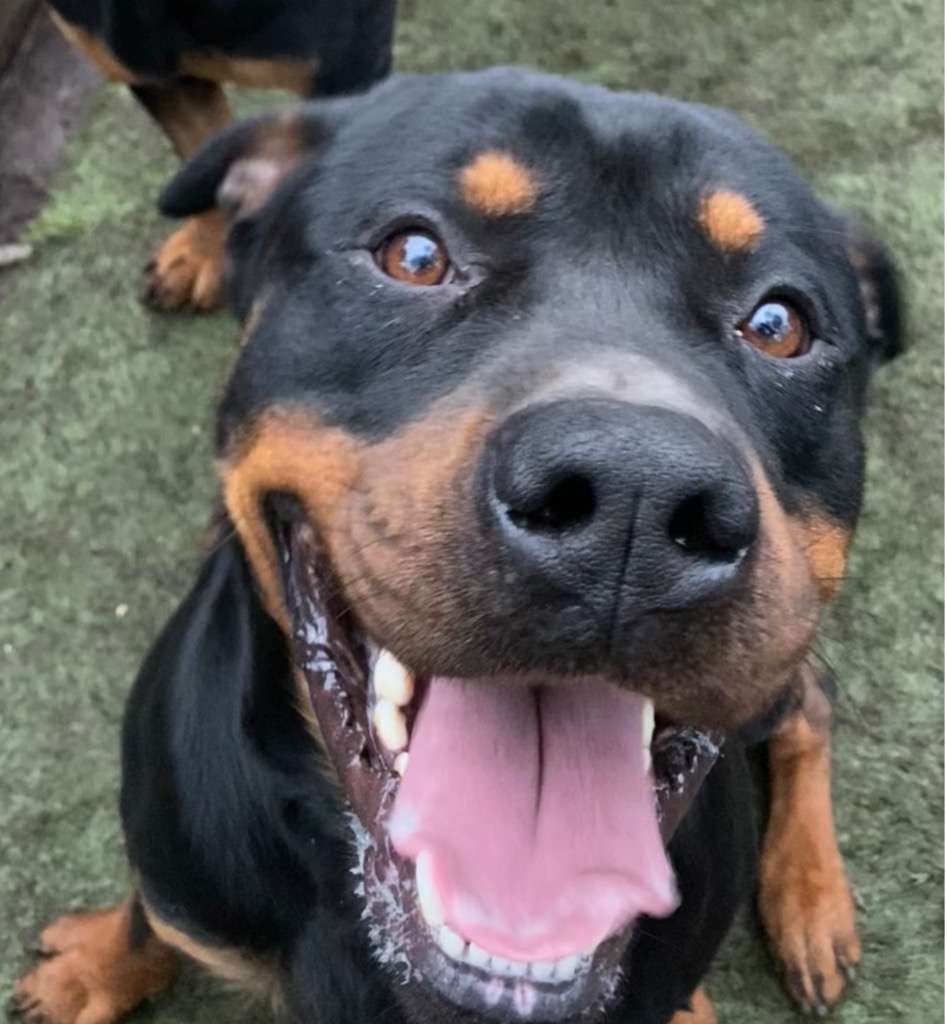 Boy is a young, vibrant and happy rottie boy.