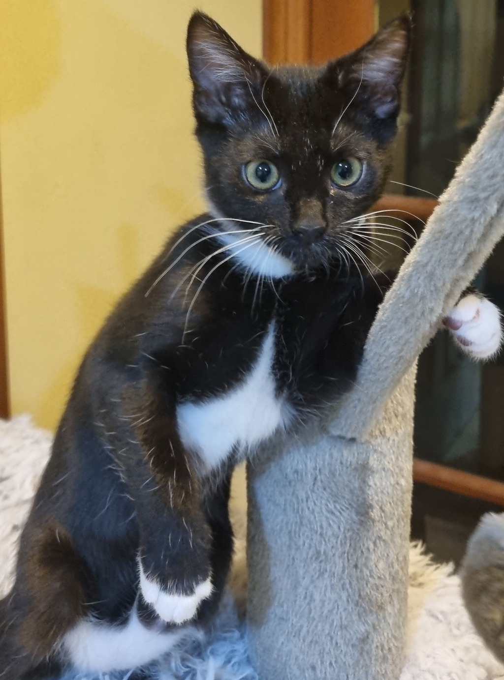 Introducing Trouble, a beautiful and affectionate 13-week-old female kitten with a heart of gold-and don't let the name fool you! This little lady is as sweet as can be, with her sleek black coat and adorable white boots. Trouble, along with her three siblings, was brought to the RSPCA at the beginning of winter, making them our precious Winter babies.