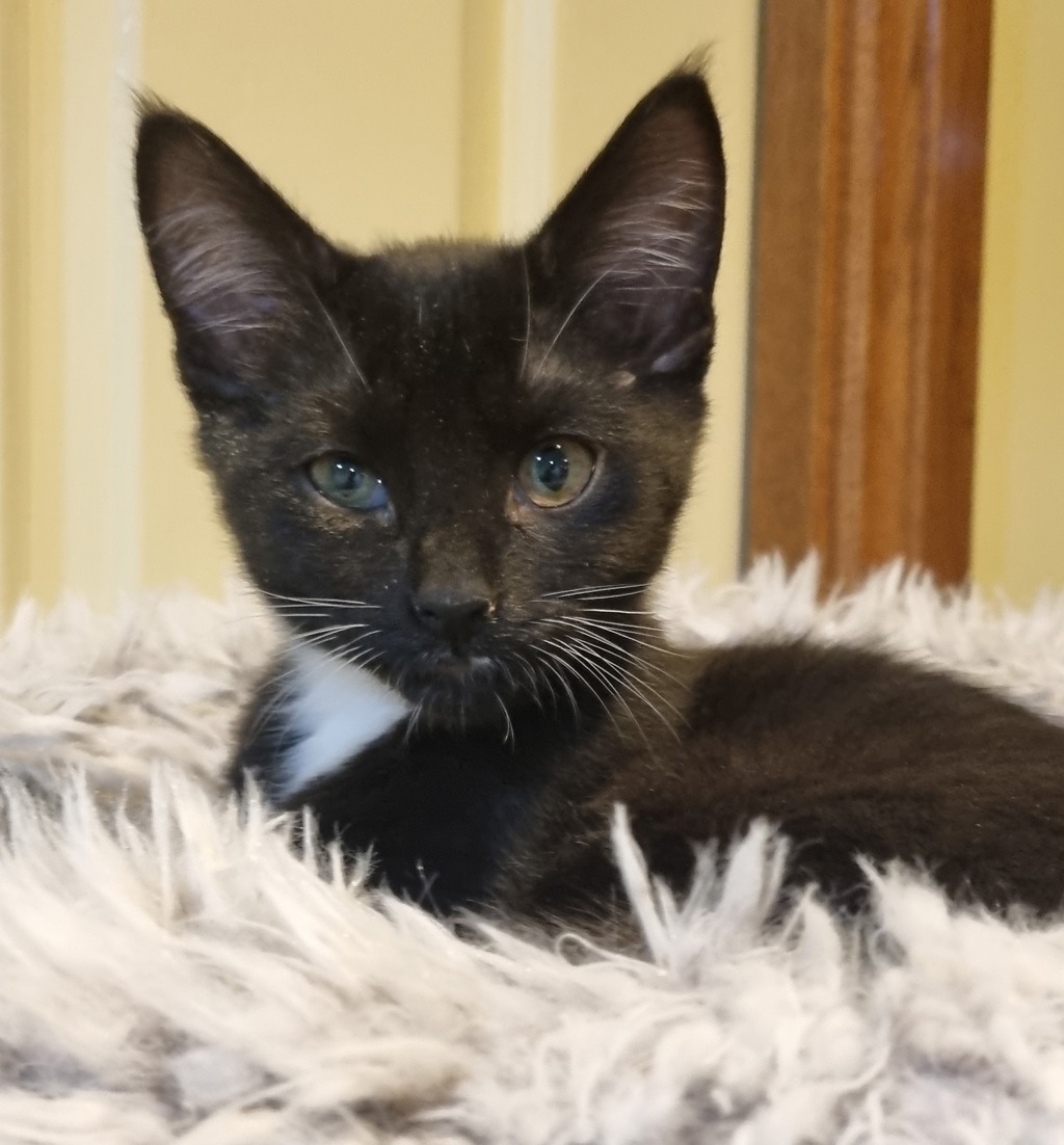 Introducing Rascal, a 13-week-old female kitten who lives up to her playful name in the most delightful way. With her sleek black fur and adorable white boots, Rascal is not only beautiful but also incredibly affectionate-she truly has a heart of gold.