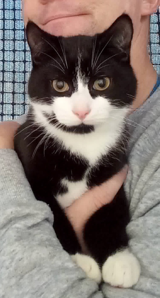 This friendly and playful kitten loves to climb and jump, often greeting you at the door or peering out the window to see what's happening. Loudly is very food-motivated and enjoys playing with his brothers. He loves company and will happily accept hugs if they don't interfere with his mealtime!