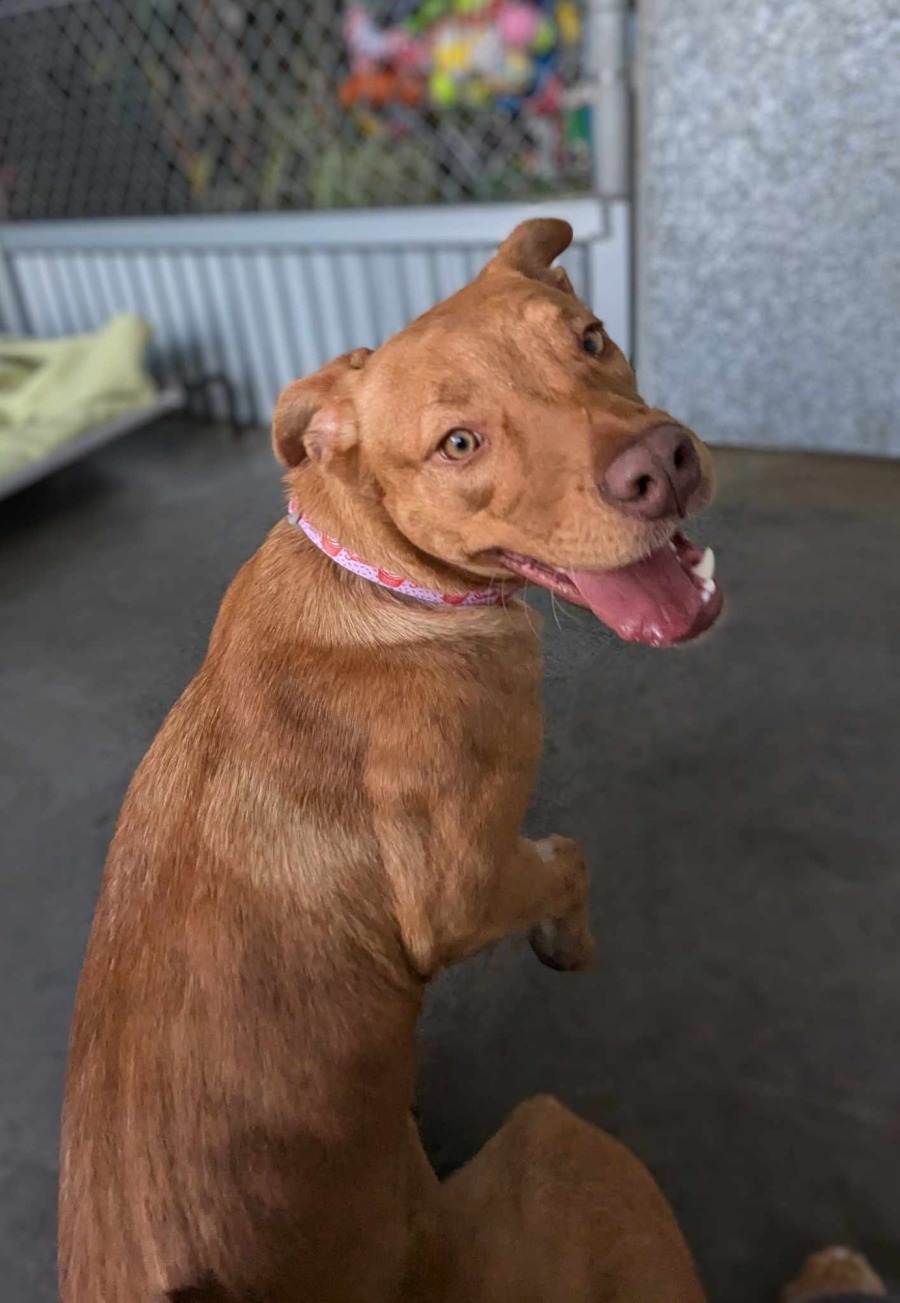 Honey was brought in to us as an unmicrochipped stray by her owners who dumped two of their dogs at different facilities on the same day. Both dogs were subsequently surrendered to the facility for rehoming. Honey's previous name was simply "Dog" which we decided to change as we felt it wasn't fitting for her beautiful nature. Honey's surrender profile states she was an outdoor dog so she isn't house trained as yet, she has no separation anxiety or food aggression, she travels well in the car, she hasn't dug under or jumped over fences, she loves having another animal for companionship, she is friendly with children & adult strangers, she is friendly with dogs but she hasn't been socialised with cats.