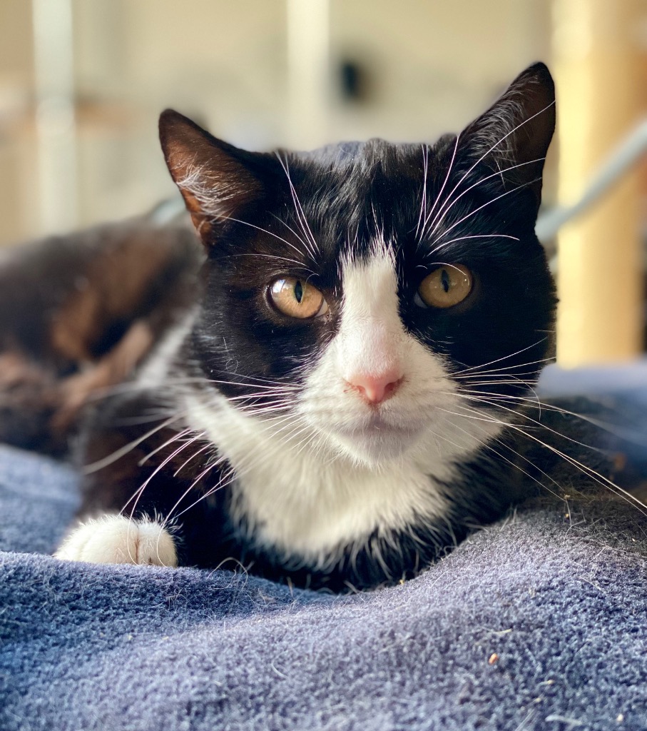 When Ned went for his vet work, it turned out that he was 9 months old, not four months old. He'd just spent so long without food his growth was stunted. Ned will probably never be a big cat, but he's filled out nicely and his fur is now plush and soft. With his stunning tuxedo looks and big golden eyes, he's quite the looker.