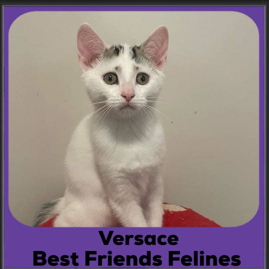 Versace is an adorable little white boy with some unique black markings, including two black dots for eyebrows, giving him a perpetually concerned expression! He is actually not concerned at all - he spends his days purring, playing, eating, and rolling on to his back for some tummy rubs. He is becoming more confident, and more cuddly each day, and is just a delight to spend time with.