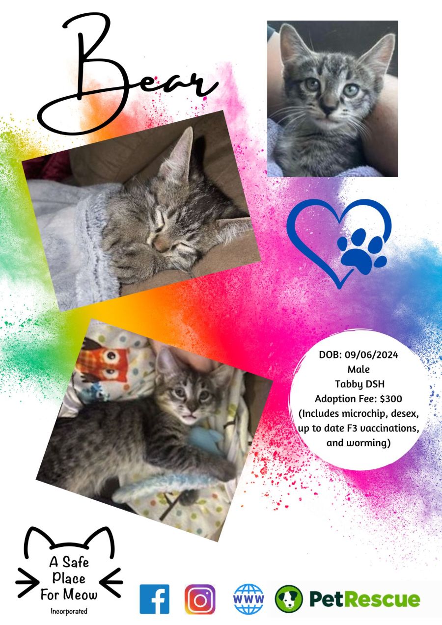 Meet Bear, a sweet and charming feline with mesmerising blue eyes. Still in his baby phase, Bear is the epitome of cuddly and affectionate. He's the kind of kitten who will nuzzle his way into your heart and home, turning every day into a delightful experience filled with warmth and love.