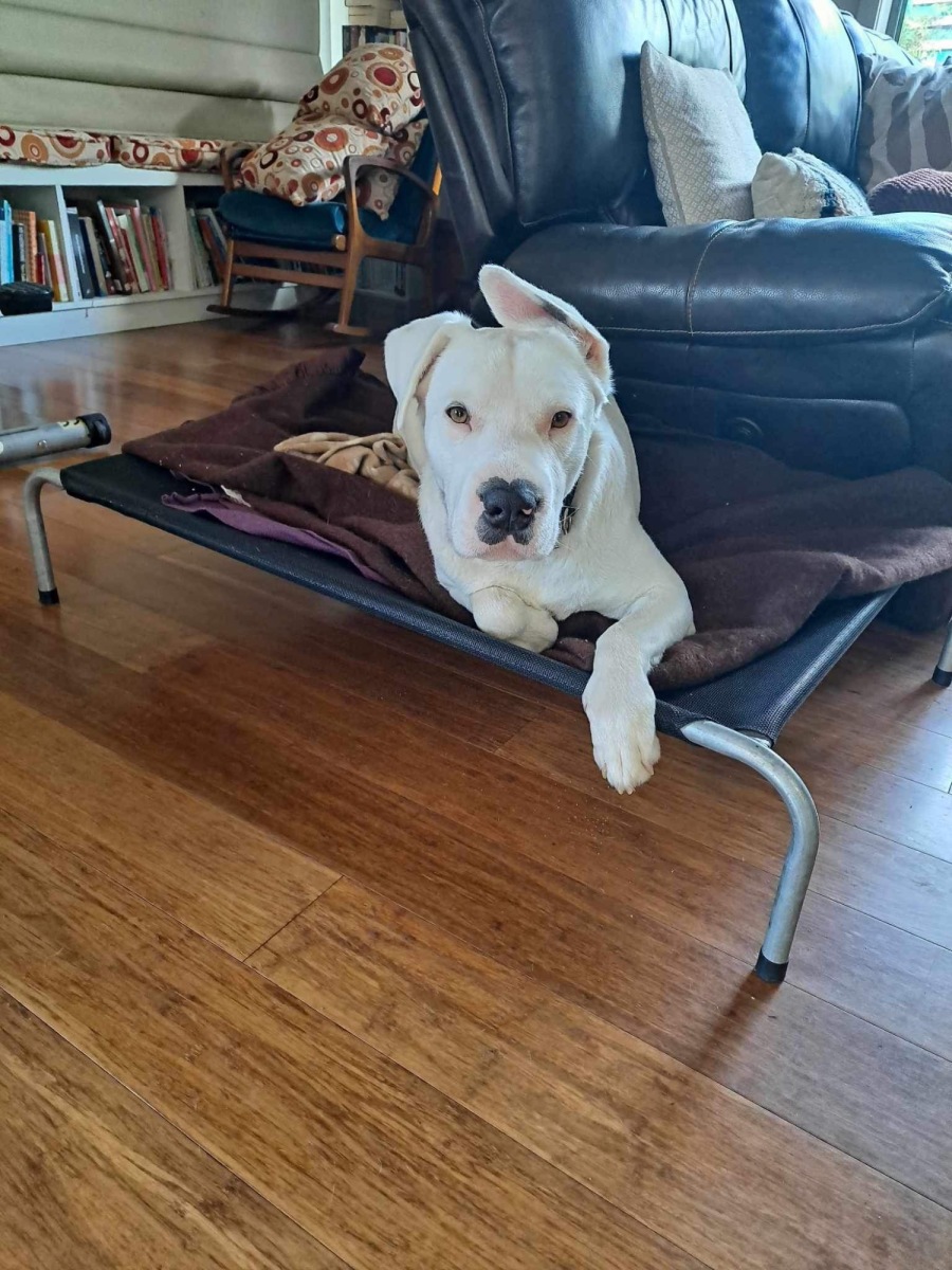 He loves his food and is not a fussy eater at all. Doesn’t mind sharing his food with my whippets, mainly the dry food though. Phoenix is getting better on the lead. He can pull a bit and is very strong, but he will be very good with more training. I walk him with both my Whippets simultaneously, so he is pretty good with that distraction. I let him off leash when we reach the park. He runs with the other dogs and wanders off alone, smelling everything. If walking past other dogs, he gets distracted, and wants to be friends, but he can be turned around and continue on our walk. He never wants to hurt them. A friend brought her 4-month-old dog to my house two weeks ago, he and Phoenix played together, doing zoomies and lying next to each other when they got tired. He is very good with teenagers. While in my care, he has not interacted with younger children. Cat-tolerant? No. This is not totally his fault, he has just learnt to chase them recently so best a home with no cats.