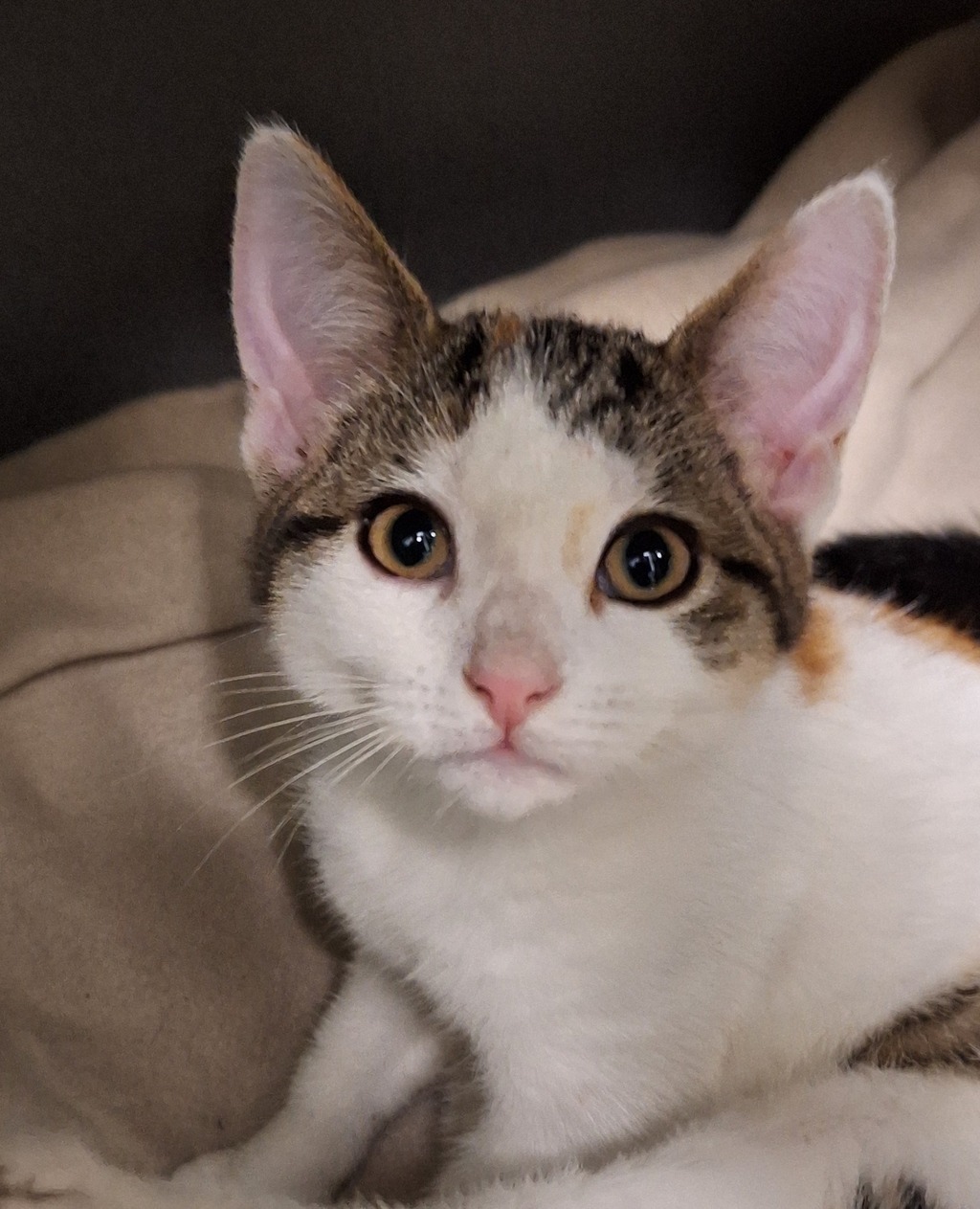 Hello, I'm Evie! I'm just a kitten, but I've got a big heart full of love to share. I'm a sweet and friendly little soul, always ready to greet everyone with a purr. I'm also very curious, constantly exploring my surroundings with wide-eyed wonder. I'm gentle too, I promise to handle your affections with the utmost care. And playful? You bet! I love to chase after toys and frolic around. I can't wait to bring joy and laughter into your home. Why should you adopt me? Well, I believe that every home needs a dash of Evie's sweetness, a sprinkle of my curiosity, and a whole lot of my playful spirit. I'm ready to be your loyal companion and fill your days with purrs and play. Will you be my forever family?
