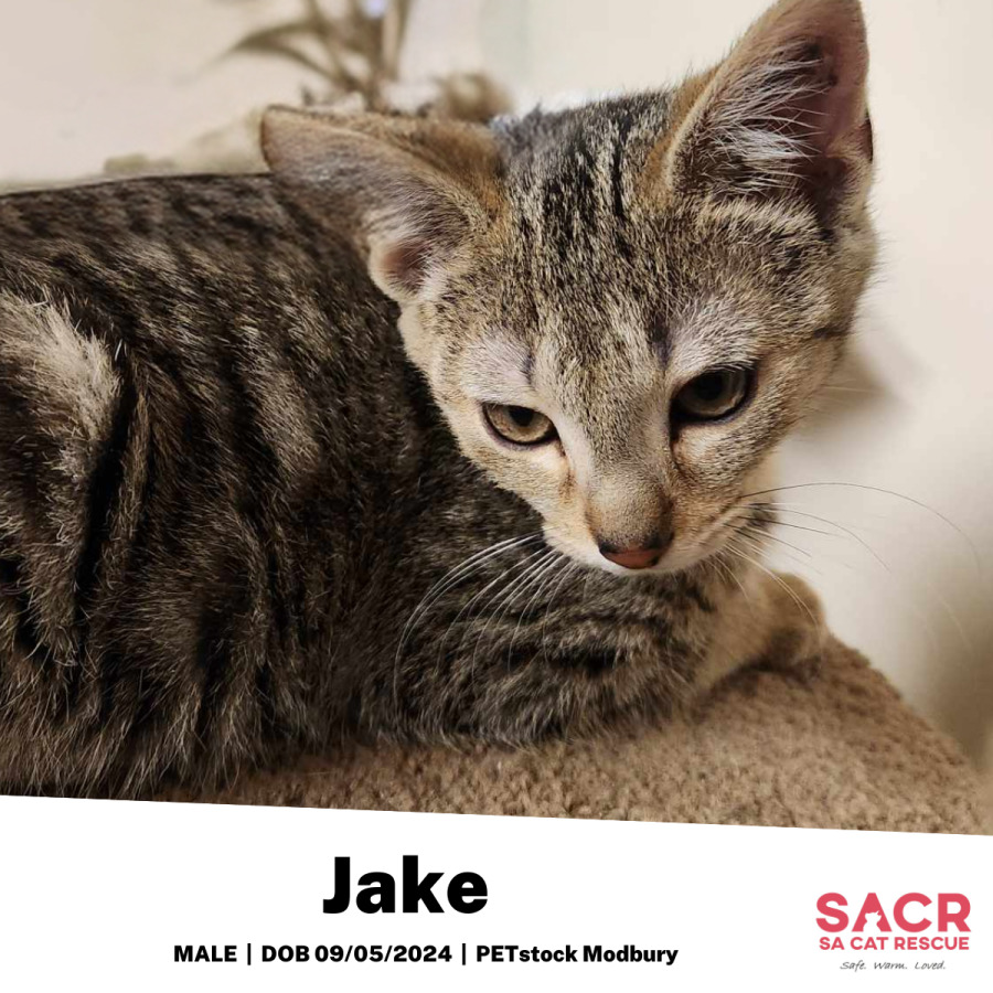 Jake's adoption fee is $195 which includes desexing, microchipping, parasite prevention, and initial F3 vaccination.