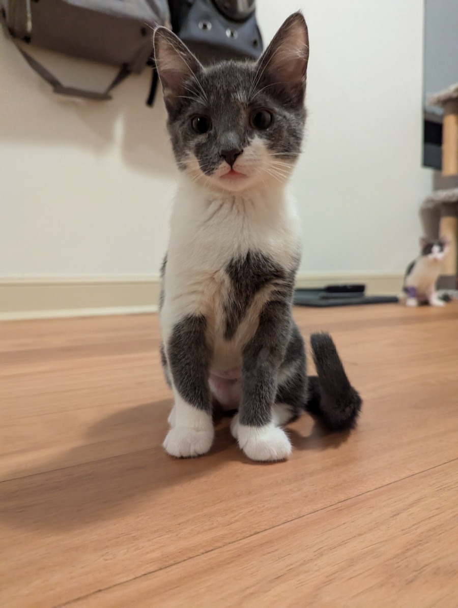 She is super playful, adventurous and affectionate. She is great on her own or with other cats. She loves hanging out with her foster brothers and doesn't let her size stop her from trying to keep up with them.
