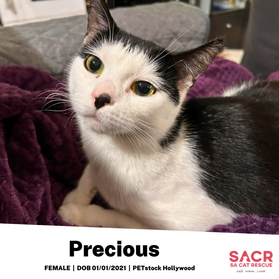 Precious is a bit particular when it comes to her dining preferences. Fast-food feline style is her jam; she only eats Whiskas, Friskies, and similar brands. This sassy lady knows what she likes and isn't afraid to turn her nose up at other premium options (much to her foster carer's dismay and frustration!). When it comes to being picked up, Precious may sometimes indulge you with baby-like cuddles but usually prefers to keep all four paws on the ground.